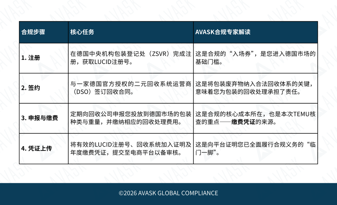 一个完整的德国包装法合规流程,实际上包含四大关键环节,缺一不可: