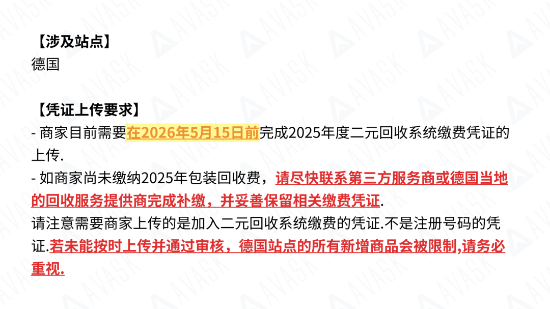 • 如果您尚未注册德国包装法,请立即联系AVASK,开启一站式快速办理通道。