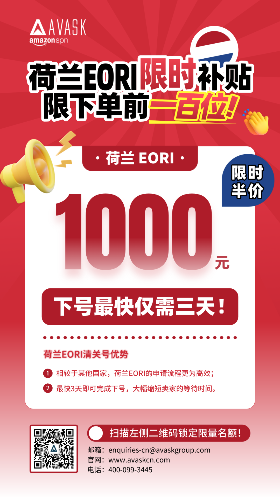 为确保跨境卖家的货物在欧盟境内畅通无阻,AVASK特此推出荷兰EORI限时优惠,原价250英镑的荷兰EORI号申请服务,现在仅需1,000元,最快3天即可下号!