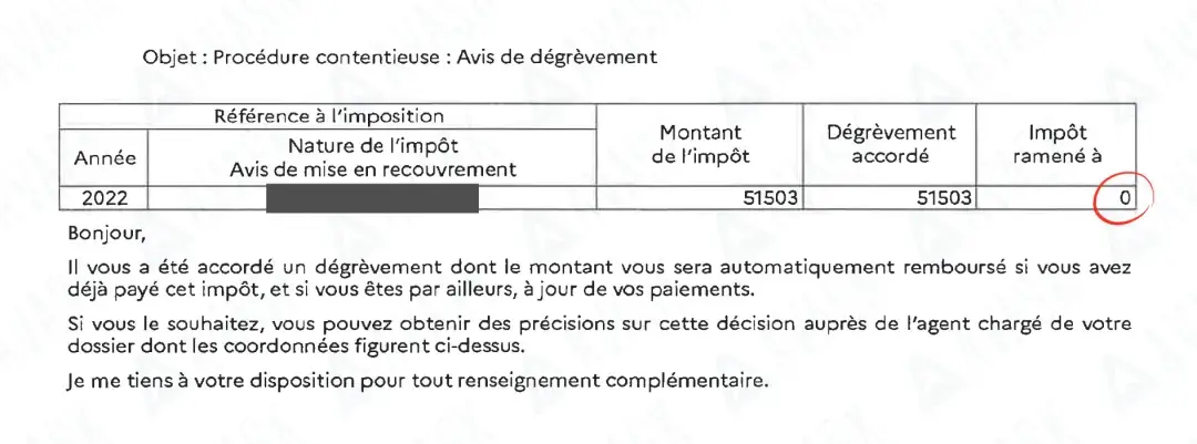 在确凿的证据和严密的法律逻辑面前,税局最终认可我们的申诉主张。就在本月(2026年4月),前方传来捷报!法国税局正式下发《减免通知》。文件白纸黑字地显示: