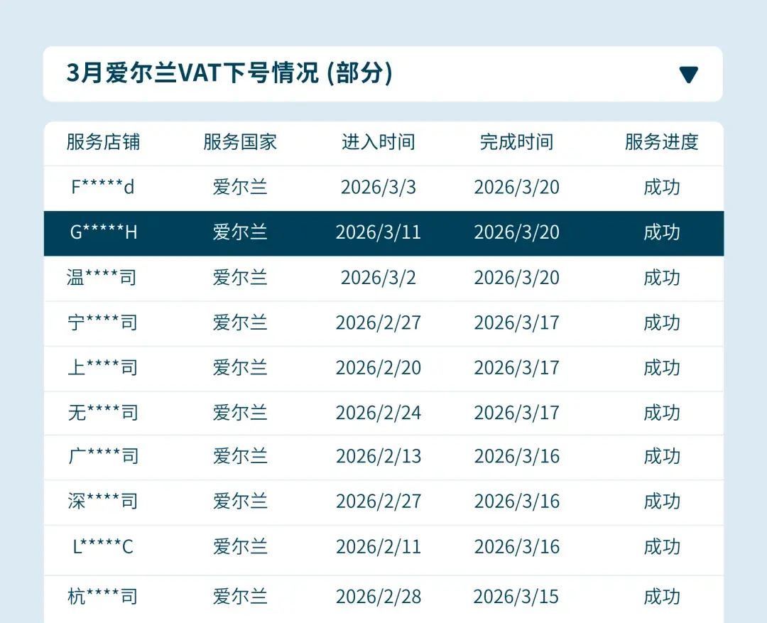 • 领跑行业,快至2周下号:行业平均下号时间需要1-3个月,反观AVASK不断刷新行业速度,成功帮卖家在短短2周内完成爱尔兰VAT下号,跃居国内跨境合规行业领先地位,帮助跨境卖家及时领取补贴!