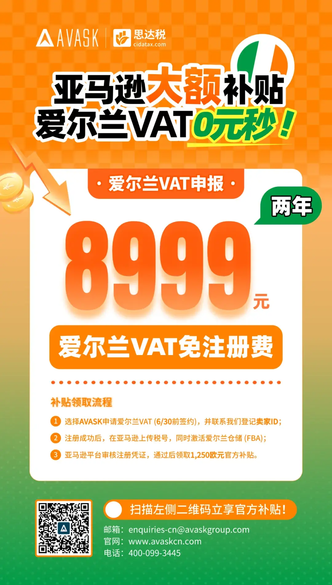 错过了去年的爱尔兰VAT注册补贴?亚马逊再次联合AVASK为跨境卖家提供1,250欧元VAT限时补贴,并加赠EORI清关号!助您零成本合规,轻松掘金新蓝海!