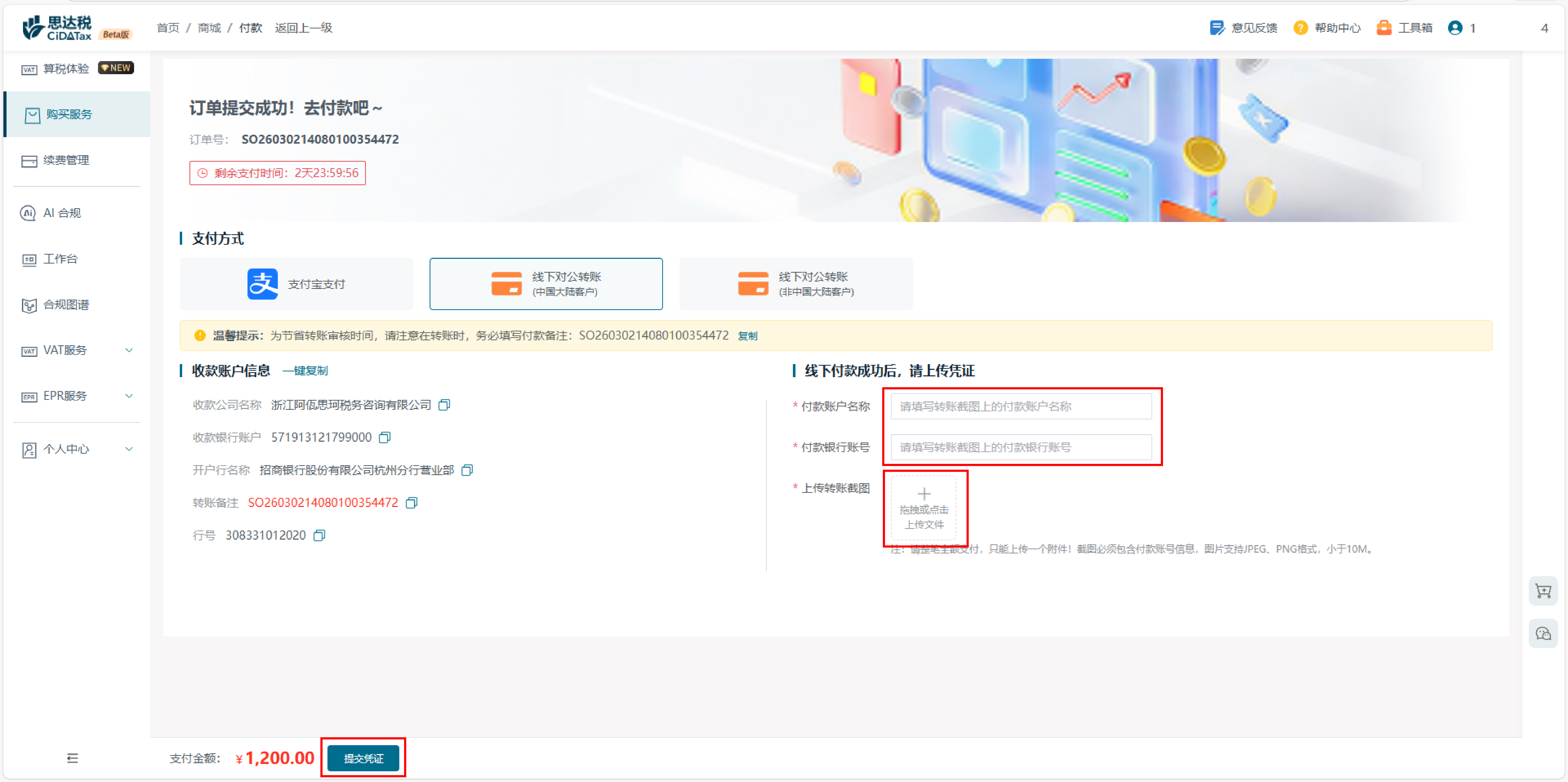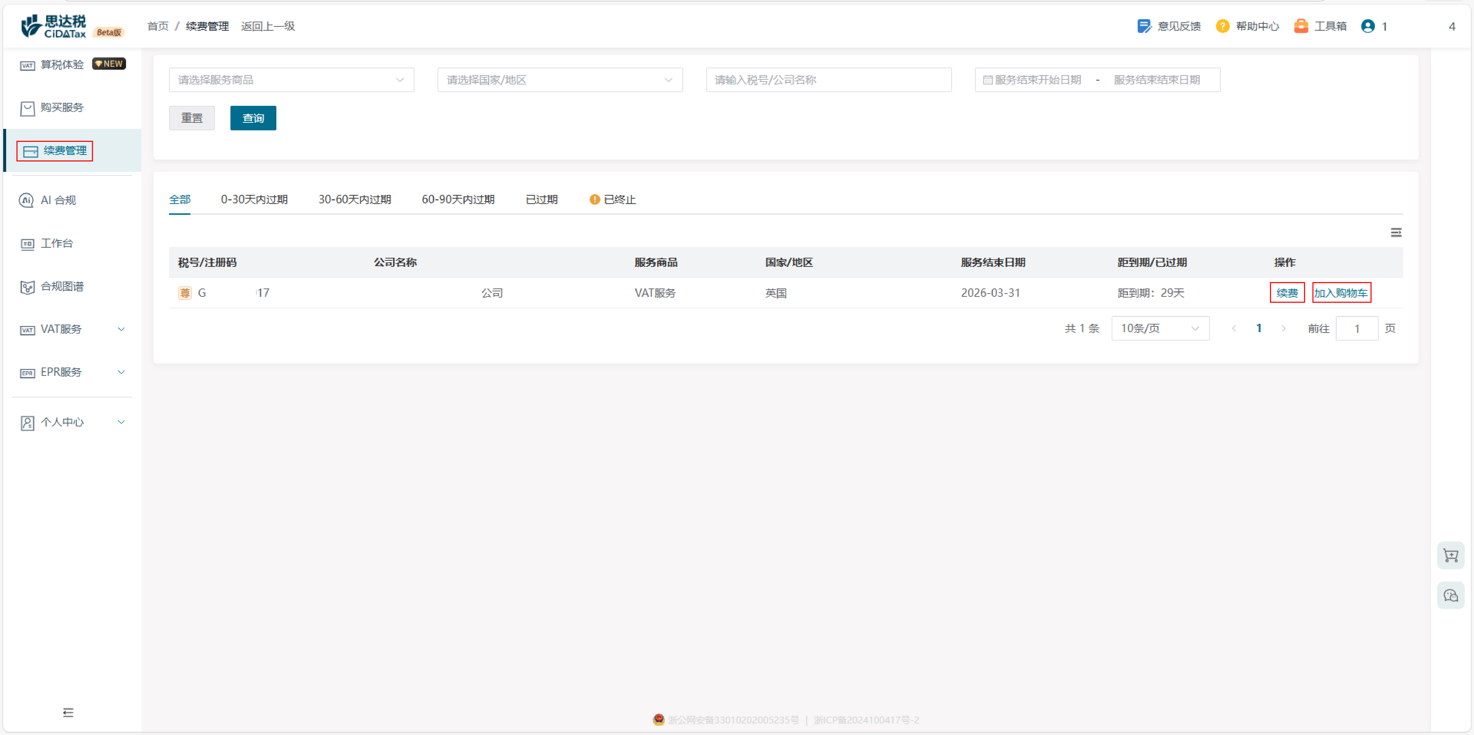 续费服务 点击【续费管理】,平台将展示90天内到期的所有服务。您可以方便地点击【续费】或【加入购物车】继续下一年的合规服务 点击续费之后按照公司类型选择欧盟公司或非欧盟公司,选择贵公司名称即可 如需要开票,选择修改开票信息,填写开票信息;点击我已阅读并同意;点击提交订单 可选择支付宝支付或者是线下汇款 请注意线下汇款需要上传支付回执 支付完成后可复制订单号通知我司人员催促财务到账通过