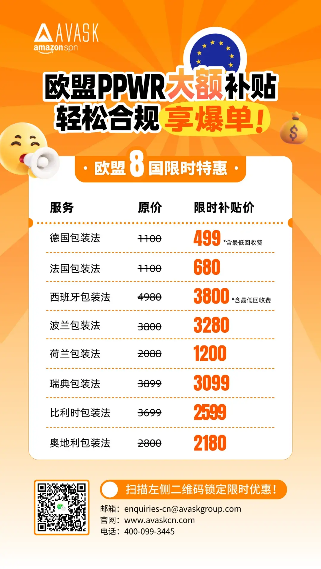 距离2026年8月12日PPWR强制生效仅剩最后5个月!为助力跨境卖家平稳度过合规转型期,AVASK现特别推出合规限时优惠方案。扫描上方二维码,即刻锁定限时优惠!