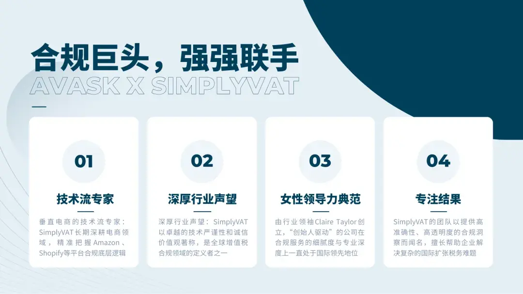 • AVASK的技术引擎:凭借技术驱动的合规平台,在增值税(VAT)、海关、生产者责任延伸(EPR)及国际监管合规方面拥有深厚造诣。