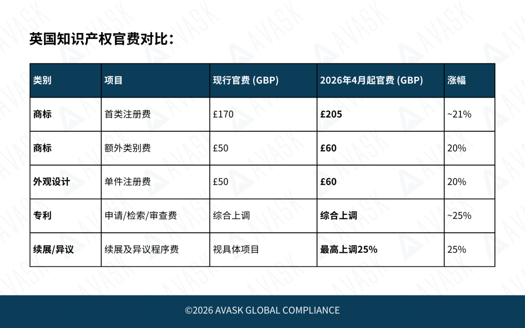 4月1日起,英国专利、商标、外观设计等官费将迎来大规模上调,平均涨幅高达25%!建议卖家抓住最后一周的黄金窗口期,提前申请/续展,锁定现行低费率。