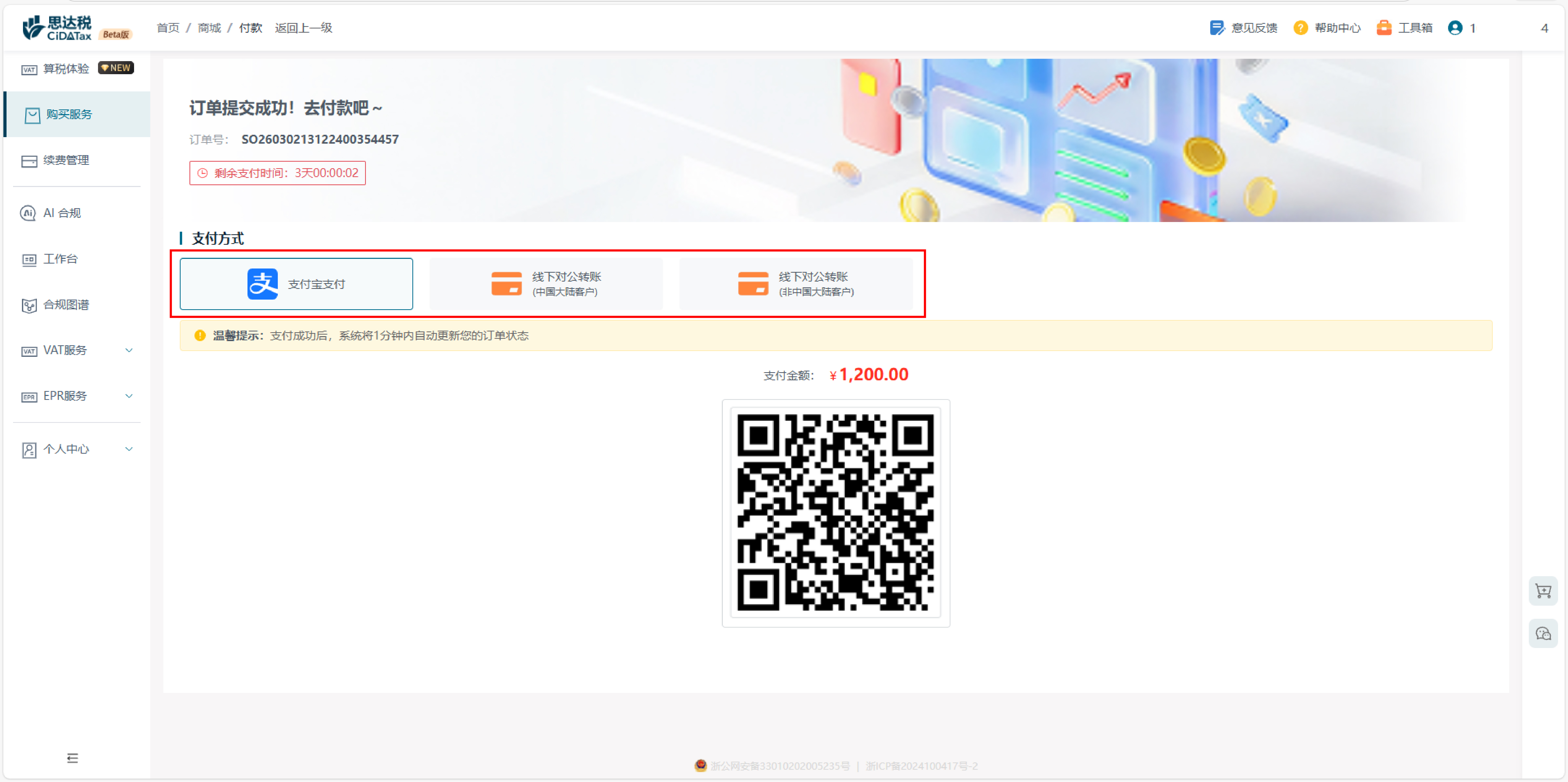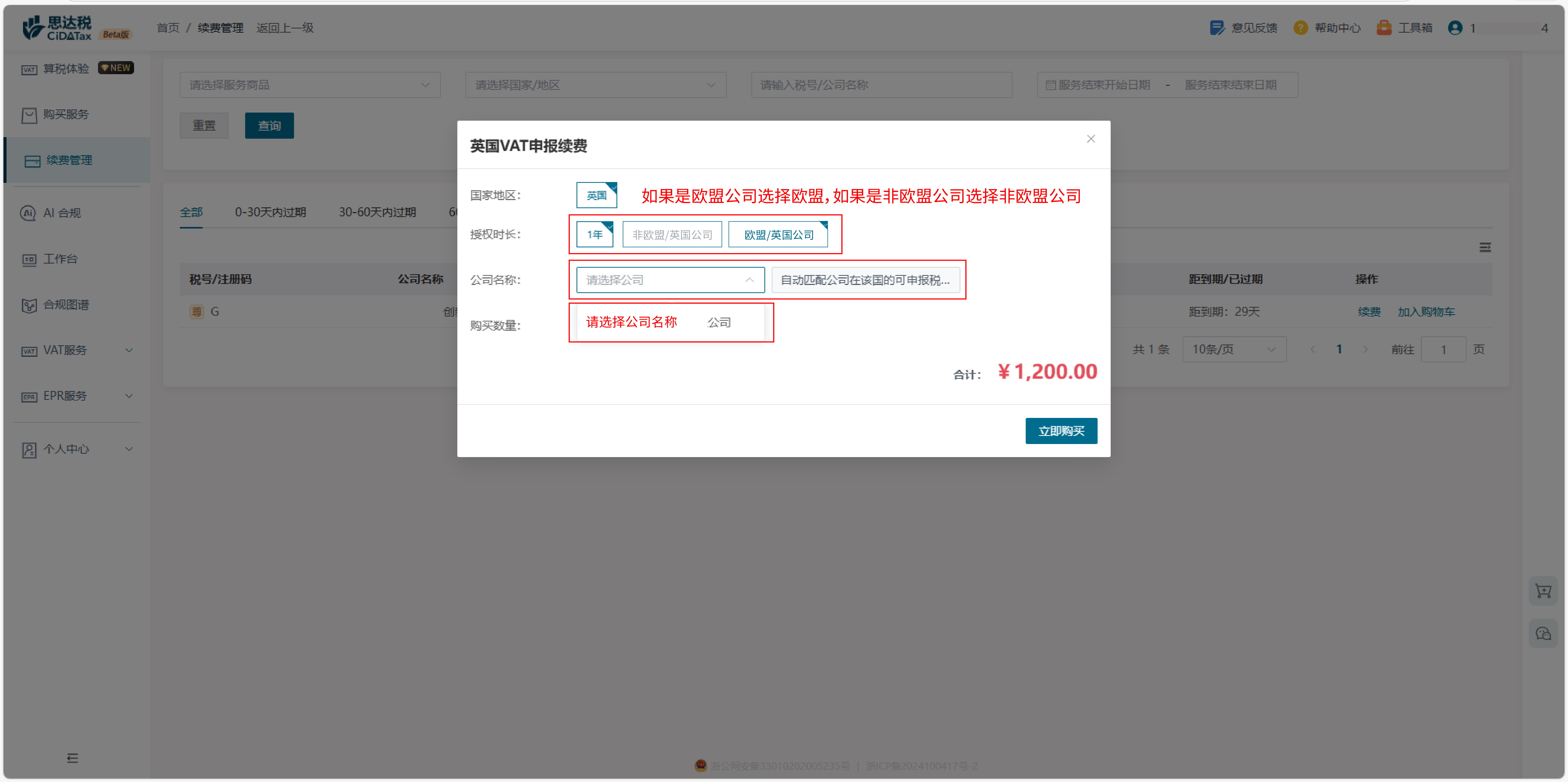 续费服务 点击【续费管理】,平台将展示90天内到期的所有服务。您可以方便地点击【续费】或【加入购物车】继续下一年的合规服务 点击续费之后按照公司类型选择欧盟公司或非欧盟公司,选择贵公司名称即可 如需要开票,选择修改开票信息,填写开票信息;点击我已阅读并同意;点击提交订单 可选择支付宝支付或者是线下汇款 请注意线下汇款需要上传支付回执 支付完成后可复制订单号通知我司人员催促财务到账通过