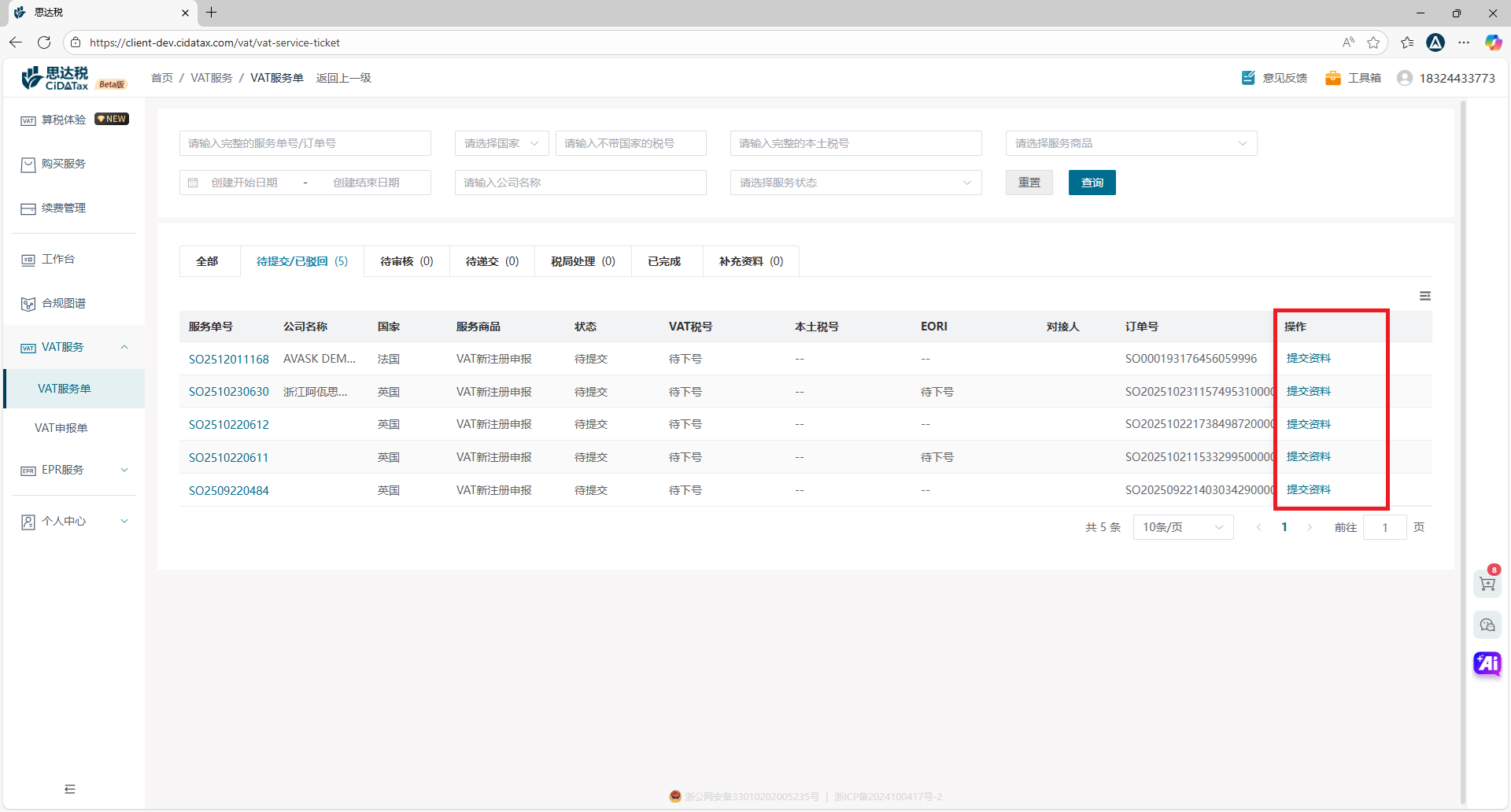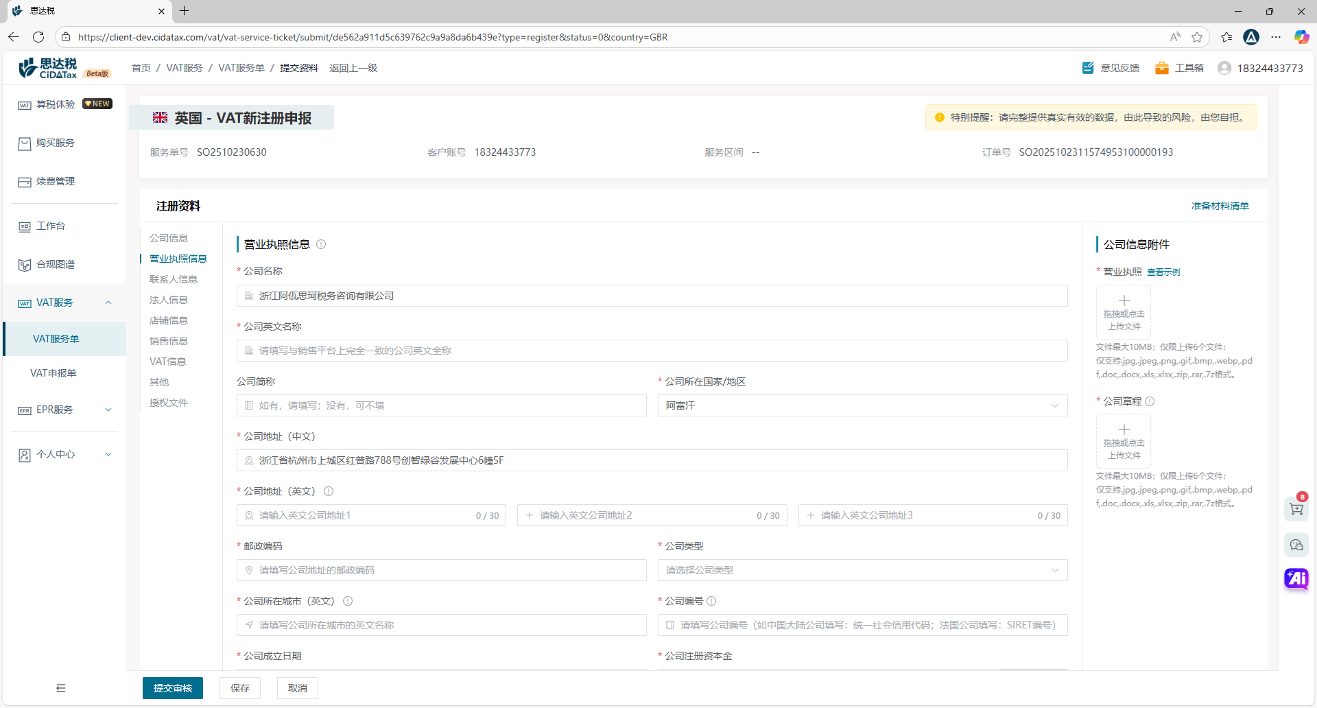 VAT服务单 提交资料点击“VAT服务单”,进入VAT服务单的全生命周期管理页面。根据不同状态的流转,全程跟踪服务单的整个服务流程。首先,您只需在“待提交”页签,点击【提交资料】进入注册/转代理的资料提交页面,提交所购买国家注册/转代理所需的数据。系统会自动根据不同国家识别并展示不同的资料清单信息。完成后,点击【提交审核】,专业合规团队将对所提交资料进行审核,通过后即可递交到税局,等待下号